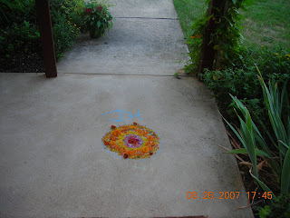 Our family celebrated a special festival, called Onam, this past weekend. We wore special Indian clothes, and set out to collect some flowers from our garden, to create a Pookkalam, or a design with flowers, on our front porch.
